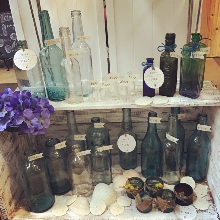 ヴィンテージボトル多数入荷中です。 花瓶としてはもちろん、そのまま飾ってもとってもお洒落です。 暑い夏に涼しげなアイテムをぜひどうぞ♪