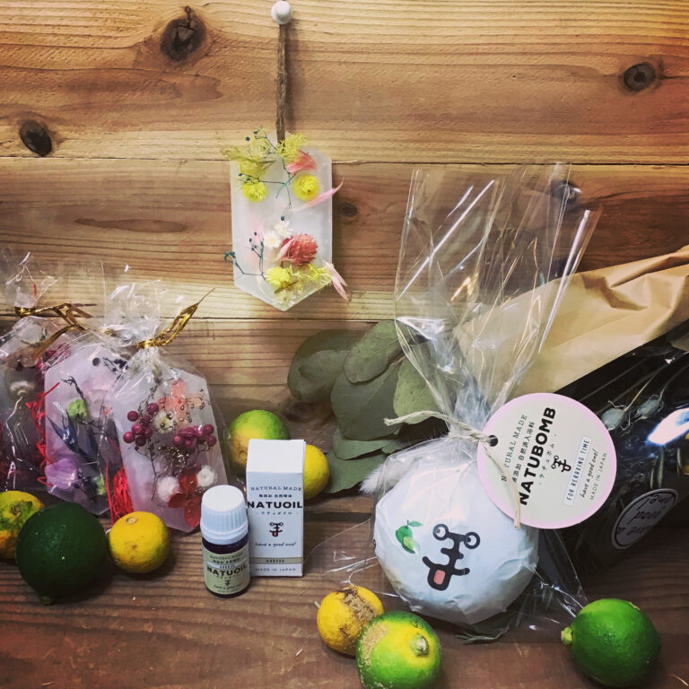 鹿児島市郡山で獲れた新鮮なかぼすを使用し丁寧に抽出した精油で 「NATUOIL」、「ATUBOM」、「アロマサシュ」を製造、販売しています。 店内はかぼすの爽やかな香りに包まれています。 手作りサシュはお求め安く、カジュアルなお部屋にぴったりです。 ご自宅で、癒しのひとときにいかがですか♪